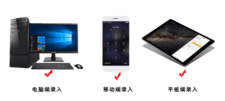 支持电脑、手持PDA、手机、平板等终端同步录入;